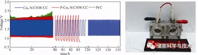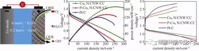 圖5 Co4N/CNW/CC雙功能電極在電化學可充電鋅-空氣電池中的應用