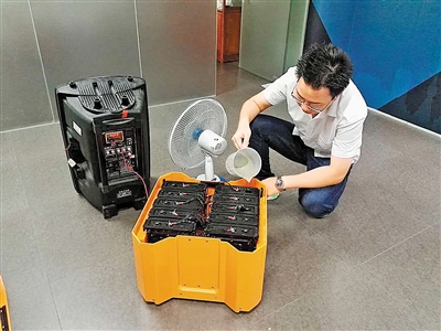 ▲海能動(dòng)力的鹽水電池可以帶動(dòng)音箱和風(fēng)扇。