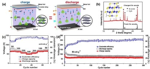 該新型電池的反應(yīng)機(jī)理為:充電時,電解液中的鉀離子運(yùn)動到錫箔負(fù)極表面,形成鉀錫合金,同時六氟磷酸根插層到正極石墨中;放電時,負(fù)極上的鉀錫合金脫鉀,同時正極石墨中的六氟磷酸根脫嵌回到電解液中。研究結(jié)果表明,該新型鉀基雙離子電池在50 mA g?1的恒定電流下充放電循環(huán)300圈后,仍保持93%的容量;且能量密度可達(dá)到155Wh/kg,與現(xiàn)有傳統(tǒng)鋰離子電池能量密度相當(dāng)。該研究成果有望代替現(xiàn)有傳統(tǒng)鋰離子電池技術(shù),并具有巨大的產(chǎn)業(yè)化應(yīng)用前景。