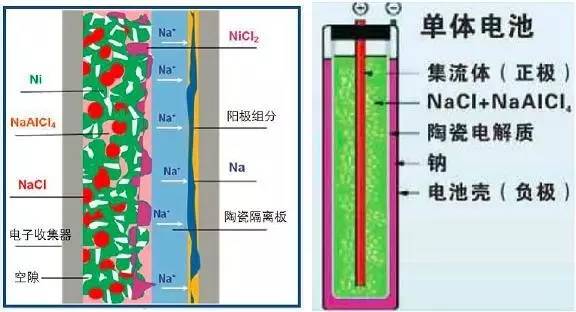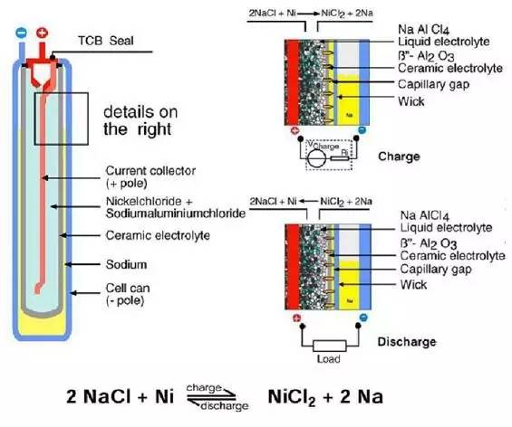 電池采用Ni粉和NaCl作為正極極原材料,NaAlCl4作為液體電解質(zhì),陶瓷管作為隔離膜,Na為負極材料。請注意,此處的陶瓷電解質(zhì)就是β"-Al2O3陶瓷管,與NaS電池一樣。陶瓷管內(nèi)填滿Ni粉、食鹽以及NaAlCl4的混合物,正極銅或鍍鎳銅棒作為集流體插入其中,陶瓷管與不銹鋼外殼之間為金屬Na,物料壓實,頂部密封。