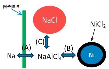 充電時,正極Ni失去電子生成Ni2+,并與電解質(zhì)中的Cl-結(jié)合,生成NiCl2。于此同時,正極電解質(zhì)中的Na+穿過陶瓷隔離板再負極得到電子,生成單質(zhì)Na;