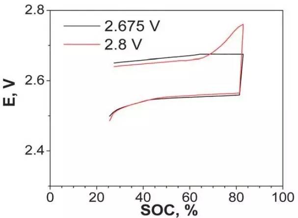 上圖顯示的是斑馬電池單體在SOC=20%~80%下的充放電曲線,紅色曲線條件為充電截止電壓2.78V,黑色為2.675V截止并浮充。無論那種情況,可以看出充放電電壓比較平坦。