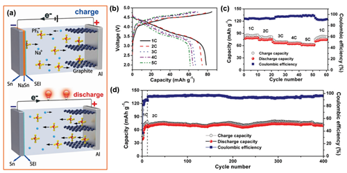 結(jié)合鈉離子與雙離子電池的綜合優(yōu)點,唐永炳及其團隊成員圣茂華、張帆、季必發(fā)等人成功研發(fā)出一種全新的基于鈉離子電解液的新型高性能、低成本錫-石墨雙離子電池。該電池直接采用錫箔同時作為電池負極和集流體,石墨作為正極;電解液采用廉價易得的六氟磷酸鈉作為鈉鹽電解質(zhì)溶于有機溶劑中。該新型電池具有超出預期的能量密度和較長的循環(huán)壽命,并且大幅降低了電池的生產(chǎn)成本。該新型電池的反應機理為:充電時,電解液中的鈉離子運動到錫箔負極表面,形成鈉錫合金,同時六氟磷酸根插層到正極石墨中;放電時,負極上的鈉錫合金脫鈉,同時正極石墨中的六氟磷酸根脫嵌回到電解液中。研究結(jié)果表明,該新型鈉離子雙離子電池在2C倍率下充放電循環(huán)400圈后,仍保持94%的容量;且能量密度可達到144Wh/kg,高于現(xiàn)有傳統(tǒng)鋰離子電池能量密度。該研究成果具有巨大的產(chǎn)業(yè)化前景,并有望代替現(xiàn)有傳統(tǒng)鋰離子電池技術(shù)。