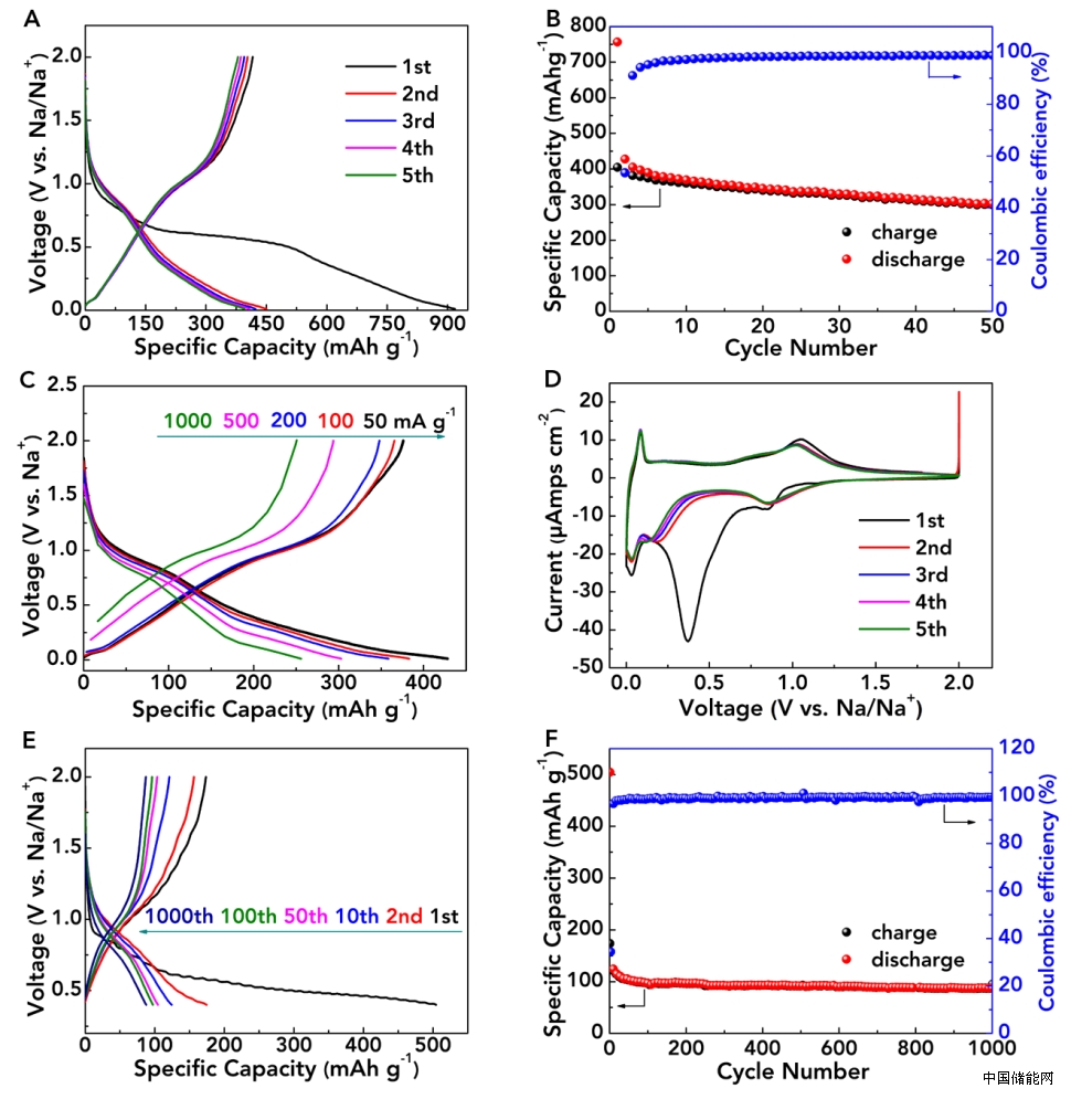 Zn-PTCA的電化學(xué)性能:充放電曲線(A)、循環(huán)性能(B)、倍率性能(C)以及CV曲線(D)