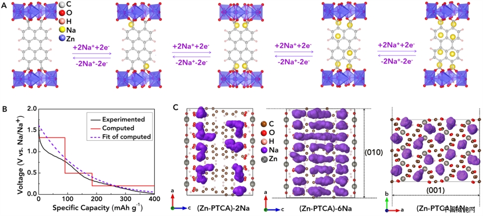 鈉離子在Zn-PTCA中的嵌入位點(diǎn)(A)、嵌入電壓(B)以及遷移通道(C)