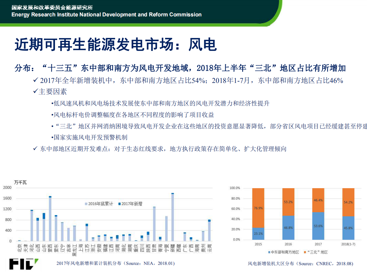 風(fēng)電進(jìn)入“十三五”以來進(jìn)入了穩(wěn)步的發(fā)展,新增裝機(jī)1503萬千瓦,占比11.2%。累計裝機(jī)1.64億千瓦,占比9.2%。風(fēng)電進(jìn)入“十三五”以來,一個明顯的特征是東中部和南方為風(fēng)電開發(fā)重要地域,右下角的數(shù)據(jù)可以看到逐年的在上升。從今年來看“三北”地區(qū)占比有所增長,占到了54%,去年是中東部和南方的地區(qū)達(dá)到了54%。這里面也有一些因素,為什么中東部大幅度的增加,由于經(jīng)濟(jì)的因素,以及“三北”地區(qū)2015年、2016年并網(wǎng)消納困境的因素影響。東中部地區(qū)近期開發(fā)難點主要是對于生態(tài)紅線的要求,中東部和“三北”于是有了這樣一些小的調(diào)整,總體上來看基本上保持各占半壁江山的水平。西北地區(qū)仍然有一定的市場發(fā)展空間,裝機(jī)總量上累計超過1000萬千瓦的省區(qū)有5個,西北有兩個。全國風(fēng)電上網(wǎng)電量在全社會用電量的比重超過10%的省區(qū)有7個,其中6個裝機(jī)占比超過20%。