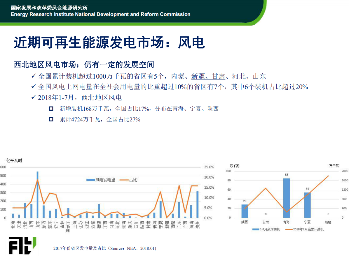 從2017年開始,國家對于棄風(fēng)棄光的問題采取了很多的政策以及相應(yīng)的有效措施,主要包括貫徹落實可再生能源發(fā)電的全國保障性的收購制度,建立風(fēng)光的預(yù)警和評價機(jī)制。挖掘電力系統(tǒng)調(diào)峰,建立輔助服務(wù)市場,去年無論是棄風(fēng)還是棄光的范圍得到控制,電量和比例都實現(xiàn)了雙降低的成果。當(dāng)然有個別地區(qū),比如西北的新疆和甘肅,棄風(fēng)的比例像今年一41到8月份,新疆超過了20%,甘肅是接近20%,這個數(shù)字是相對比較高的。