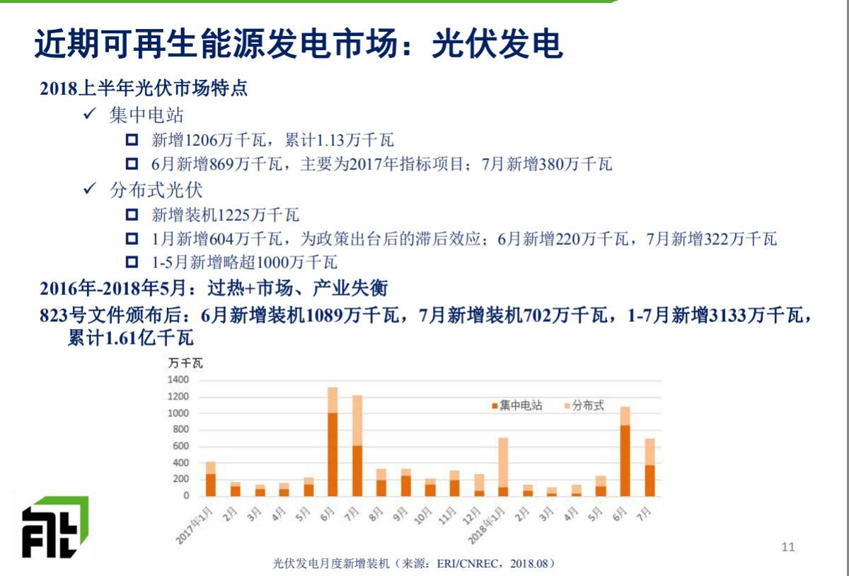 國內(nèi)的光伏發(fā)電市場呈現(xiàn)了持續(xù)快速增長的形勢,2016年新增裝機(jī)3400千瓦,2017年新增裝機(jī)5306萬千瓦。國家出臺了文件,對于需要國家補(bǔ)貼的建設(shè)規(guī)模加以適度引導(dǎo)和控制,盡管這樣新增裝機(jī)仍然是非常大的數(shù)字,接近了50%的水平。上半年光伏發(fā)電新增裝機(jī)超過了2400萬千瓦,這個數(shù)字和去年同期相比基本持平,累計裝機(jī)超過了1.5億千瓦,發(fā)電量占比達(dá)到了2.6%。上半年國家的光伏發(fā)電市場分布特點是集中式的光伏發(fā)電電戰(zhàn)基本上占據(jù)了50%,各占50%,超過了20萬千瓦的水平。一直到823號文件出臺,光伏發(fā)電市場以及產(chǎn)業(yè)出現(xiàn)了一些局部的過熱以及產(chǎn)業(yè)失衡的局面。為了引導(dǎo)產(chǎn)業(yè)的健康發(fā)展出臺了823號文件。盡管如此在823號文件之后,政策出臺還是有滯后的效應(yīng),頒布以后6月份的新增裝機(jī)有一個搶政策,當(dāng)月還是超過了1089萬千瓦,7月新增裝機(jī)超過了702萬千瓦,使我們目前的累計裝機(jī)超過了1.61億千瓦的水平。