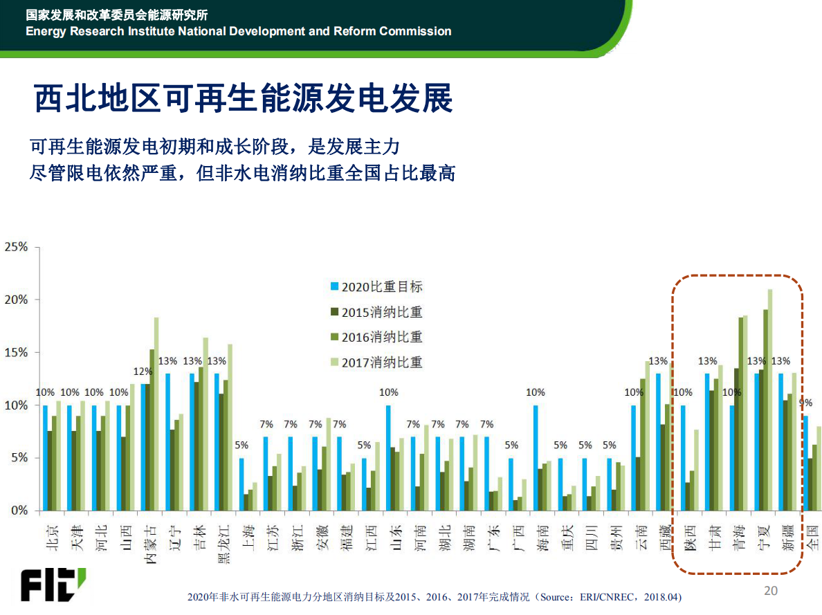 近期首要解決西北地區(qū)可再生能源消納問題,后期才會有一定的發(fā)展空間。從今年的情況上來看,風(fēng)電的監(jiān)測預(yù)警2018年發(fā)布的結(jié)果,新疆、甘肅仍是紅色預(yù)警區(qū),尤其是寧夏從2016年的紅色直接減為綠色,還是有很大的顯著變化。光伏發(fā)電今年上半年的市場監(jiān)測評價結(jié)果,新疆、隴西是紅色,所以解決消納問題是首要的任務(wù)。提升可再生能源能源在西北地區(qū)的利用性是非常重要的,西北地區(qū)風(fēng)光資源豐富,我們不考慮棄風(fēng)棄光限量的情況下,其他地區(qū)煤電價格比較低,在推進(jìn)市場化的方面,風(fēng)光需要跟非常便宜的電力相比,這樣可能對于實現(xiàn)平價上網(wǎng),在西北地區(qū)雖然有天然的太陽能和風(fēng)能的資源優(yōu)勢,但挑戰(zhàn)仍然還是非常大的。我們對2020年的補(bǔ)貼做的需求分析,可以看出西北地區(qū)仍然是高于全國的平均水平,高于大部分地區(qū)的水平。