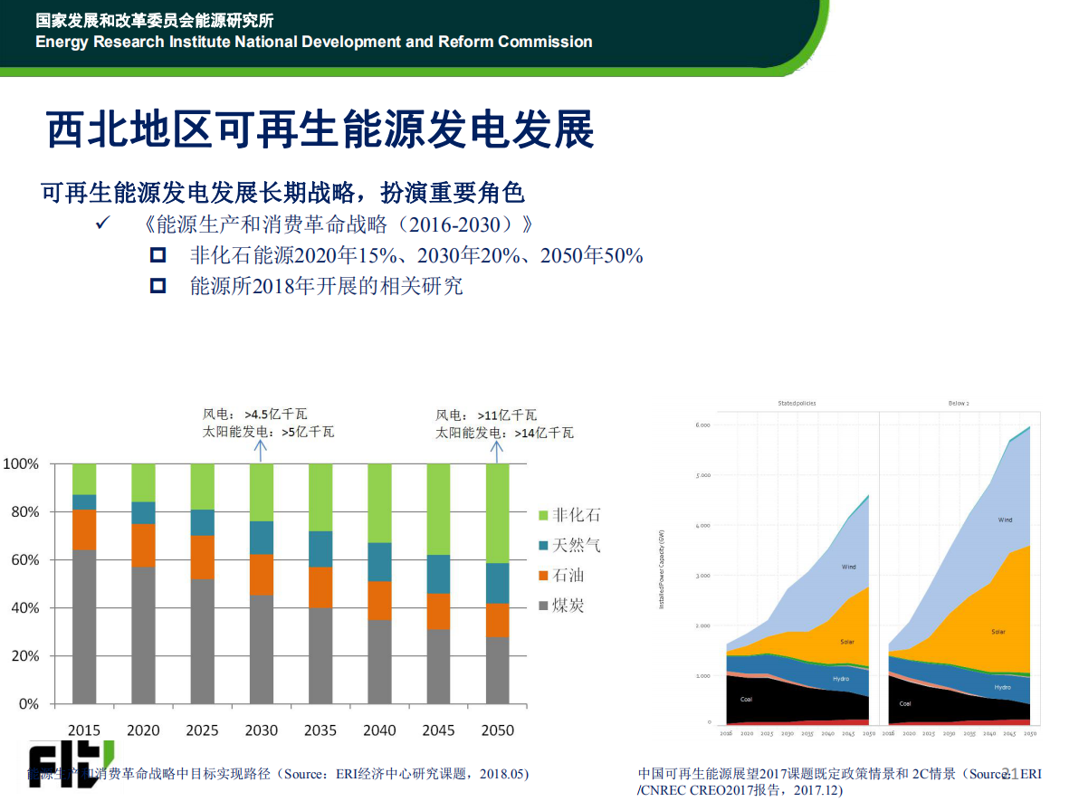 西北地區(qū)可再生能源的發(fā)展,在初期和成長階段,應(yīng)該說資源條件豐富的西北地區(qū)是發(fā)展的主力,盡管我們說西北地區(qū)風(fēng)光限電比較嚴(yán)重,但非水電消納比重在全國占比最高。從長期發(fā)展戰(zhàn)略上來看,西北地區(qū)的可再生能源發(fā)展扮演了一個很重要的角色。去年國家提出來《能源生產(chǎn)和消費革命戰(zhàn)略2016—2030》,提出2020年非化石能源占比15%,2030年占比20%,2050年占比50%。從這張圖上可以看到,即使是這樣,2050年非化石情景中也只是達(dá)到了47%,離50%還有一定的距離。在既定的情景下,風(fēng)光的裝機(jī)量超過15億千瓦的水平,到2050年才能夠?qū)崿F(xiàn)既定的目標(biāo)。2017版的可再生能源展望報告中的能流圖,這個是2050年的能量圖,我們的能源結(jié)構(gòu)按照這個情景分析,可以發(fā)生根本性的變化。對于西北地區(qū)2030年預(yù)期的發(fā)電量是1.4萬億千萬時,可再生能源即使在既定政策的情景也要占據(jù)一半的水平。2050年全部發(fā)電量西北地區(qū)達(dá)到1.7到2.3萬億千瓦時的水平,其中可再生能源占據(jù)的比例接近80%。所以未來的發(fā)展空間很大。