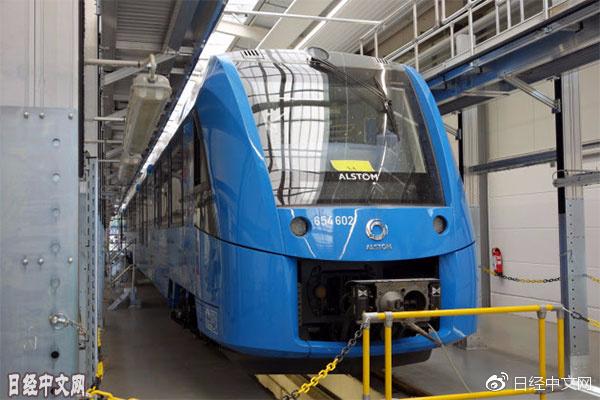 法國鐵路車輛企業(yè)阿爾斯通在德國薩爾茨吉特的工廠制造了16日啟動(dòng)商業(yè)運(yùn)行的燃料電池列車。藍(lán)色的車體外部有表示氫的“H?”字樣。