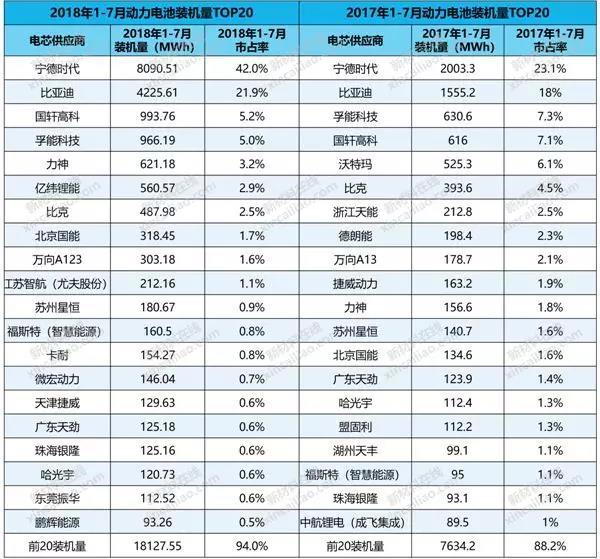 相關(guān)數(shù)據(jù)顯示,2018年1-7月國內(nèi)動力電池裝機(jī)量呈現(xiàn)寡頭集占型,寧德時代和比亞迪占比分別為42%和21.9%。