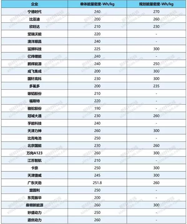圖表:2018年三元動力電池公司能量密度及規(guī)劃