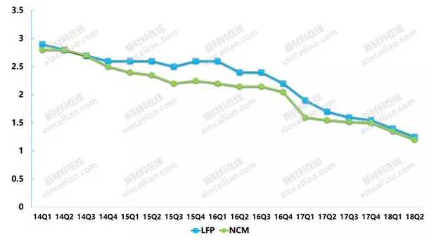 2016年至今的電池價格經(jīng)歷了幅度較大的下滑,2018年第二季度,三元電池平均價格為1.2元,同比下滑了44%。