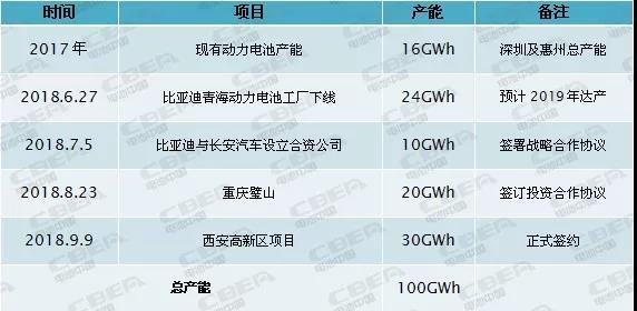 據(jù)電池中國網(wǎng)了解,截止到2017年年底,比亞迪動力電池的總產(chǎn)能是16GWh,其中6GWh是三元電池,10GWh是磷酸鐵鋰電池;2018年6月27日,比亞迪規(guī)劃產(chǎn)能24GWh的青海動力電池工廠正式下線,預計2019年全部投產(chǎn);7月5日,比亞迪與長安汽車簽署戰(zhàn)略合作協(xié)議,成立動力電池合資公司,規(guī)劃產(chǎn)能10GWh;8月23日,比亞迪與重慶璧山區(qū)政府就動力電池年產(chǎn)20GWh產(chǎn)業(yè)項目簽訂投資合作協(xié)議;9月9日,比亞迪30GWh動力電池項目簽約儀式在西安高新區(qū)舉行。至此,比亞迪動力電池規(guī)劃總產(chǎn)能已達100GWh。動力電池應用分會統(tǒng)計數(shù)據(jù)顯示,2017年全國動力電池出貨量才不過44.66GWh,而僅僅比亞迪一家其簽約產(chǎn)能就超過了這一數(shù)字的兩倍,更何況還有動力電池出貨量在比亞迪之上的寧德時代!