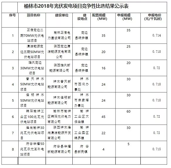 中國儲能網(wǎng)訊:2018年9月19日至2018年9月21日,榆林市發(fā)改委根據(jù)《關(guān)于印發(fā)2018年榆林市光伏發(fā)電項(xiàng)目競爭配置辦法的通知》(榆政發(fā)改發(fā)〔2018〕380號)要求,對參選項(xiàng)目進(jìn)行了審核并形成了配置意見,電站價格0.714元至0.72元。