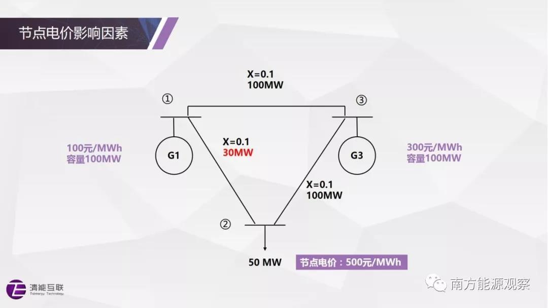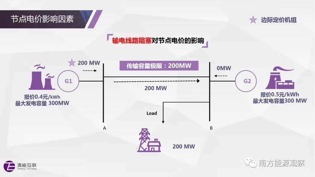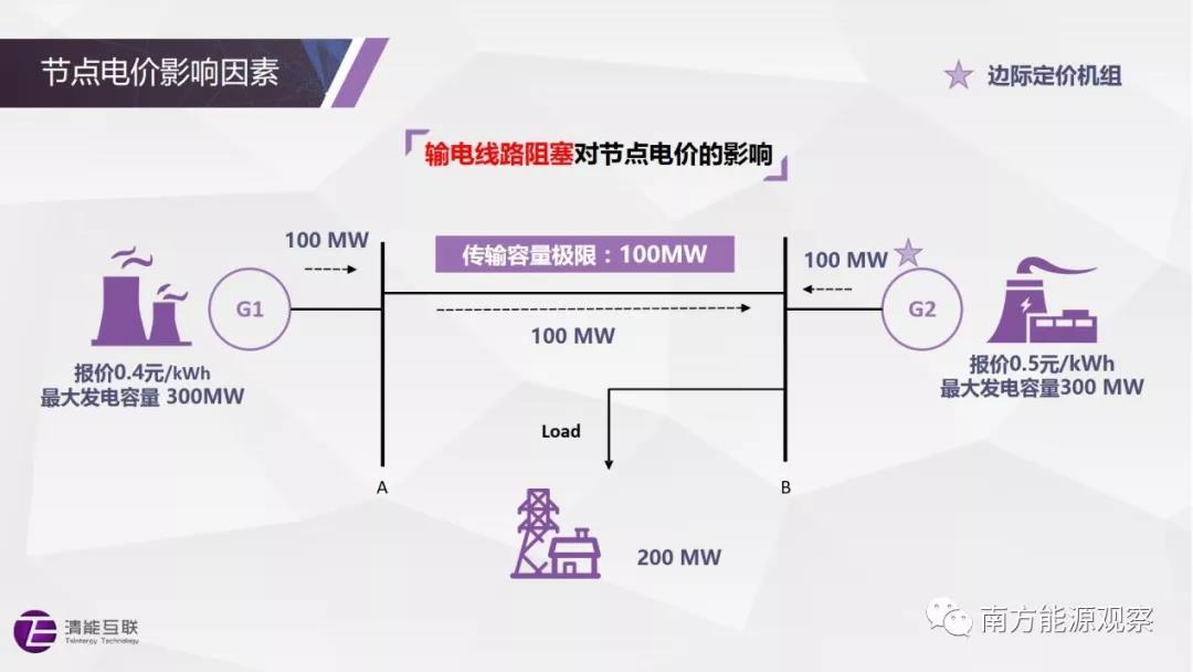 在節(jié)點電價的理解上,一個常見的疑問是節(jié)點電價是否都能夠找到相應的機組報價。在沒有網(wǎng)絡(luò)阻塞、不考慮網(wǎng)損價格分量的情況下,這個結(jié)論是成立的,任何節(jié)點的電價都等于全系統(tǒng)邊際機組的報價。然而,當存在網(wǎng)絡(luò)阻塞時,節(jié)點電價與機組報價在數(shù)值上未必是對應關(guān)系。