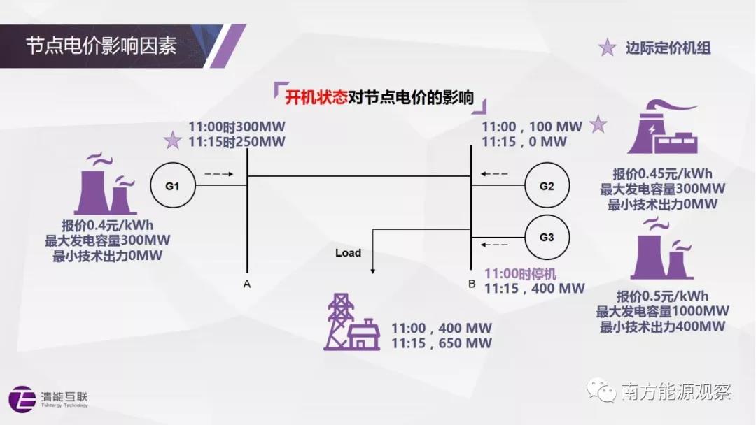 11:15時,系統(tǒng)負荷為650MW,G1、G2的發(fā)電容量不足以滿足負荷需求,因此G3開機。由于G3的最小技術(shù)出力為400MW,此時G2降低到最低出力0MW,G1發(fā)250MW,邊際機組為G1,節(jié)點電價為0.4元/kWh??梢?,從11:00-11:15,雖然系統(tǒng)負荷上升,但受新開機組G3最小技術(shù)出力的影響,節(jié)點電價不升反降。
