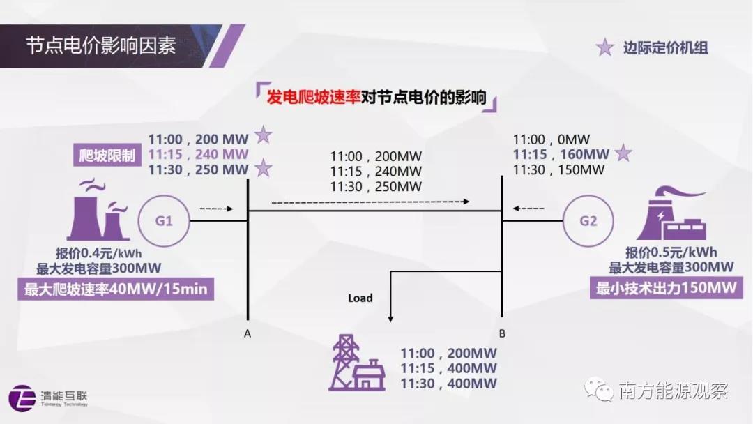 11:15時,負荷增加到400MW,G1報價比G2低,如無爬坡約束,則理應由G1增出力滿足負荷的增加,但由于G1受爬坡約束,僅能達到240MW出力,剩余負荷由爬坡速度較快的高價氣機G2開機滿足,此時B地由G2定價,節(jié)點電價為0.5元/kWh。