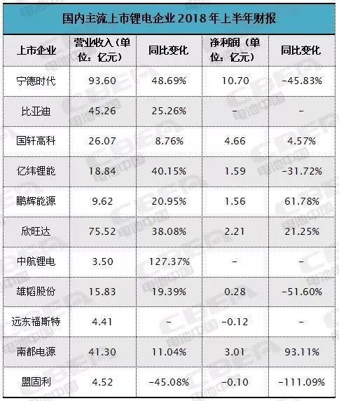 數據顯示,今年上半年,寧德時代以93.60億元的營業(yè)收入在鋰電池業(yè)遙遙領先,比亞迪電池業(yè)務以45.26億元的營業(yè)收入緊隨其后。動力電池應用分會數據顯示,2018年上半年動力電池裝機總量為15.45GWh,其中寧德時代以6.5GWh的裝機量領先同業(yè),市場占有率達42%,這也支撐了獨角獸寧德時代營業(yè)收入同比48.69%的高增長。不過,寧德時代上半年凈利潤卻同比減少45.83%,究其緣由,主要是寧德時代上年同期轉讓了持有的普萊德新能源電池科技有限公司股權取得的處置收益影響,扣除轉讓普萊德的處置收益及其他非經常性損益項目對業(yè)績的影響后,凈利潤同比增加36.55%。