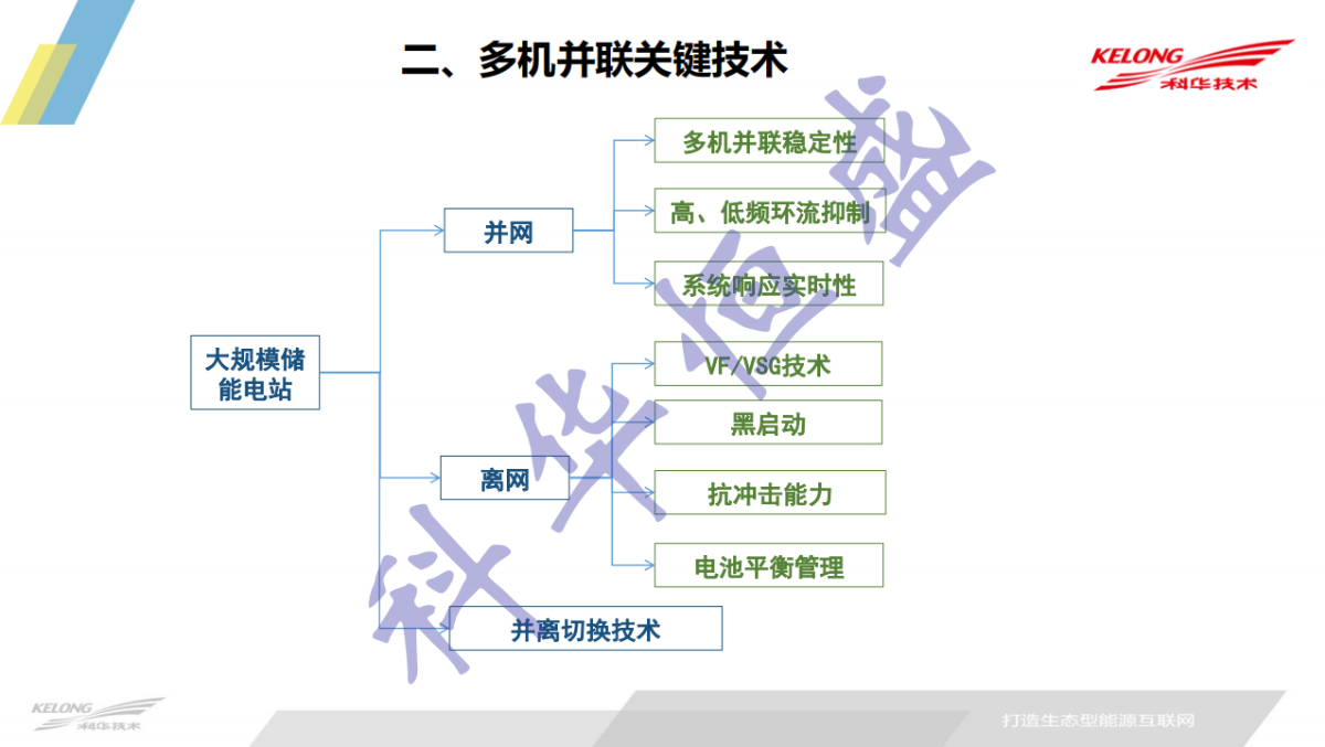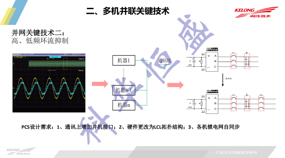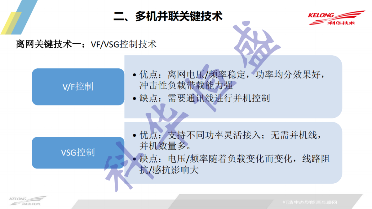 下面介紹一下并機技術??迫A主要從三個方面介紹這一塊。并網(wǎng)方面,科華主要有三個點,對電網(wǎng)的大規(guī)模應用會比較突出的一個點,就是多機并聯(lián)的穩(wěn)定性,還有高、低頻環(huán)流,還有系統(tǒng)響應性,離網(wǎng)功能的話也是它很重要的一個功能,主要是VF/VSG技術的探討,還有離網(wǎng)的黑啟動,還有抗沖擊能力、電池平衡管理。
