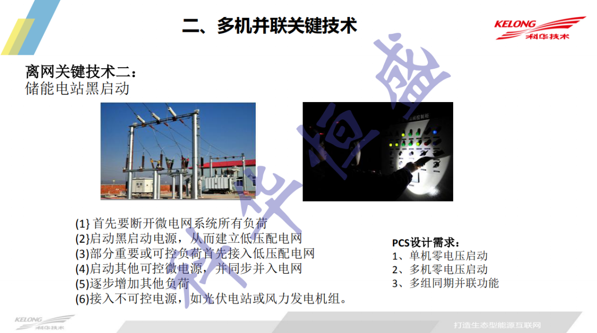 離網(wǎng)的黑啟動,在我們電力系統(tǒng)上面非常的關鍵,一旦電網(wǎng)停電了,整個系統(tǒng)就起不來了,儲能是不是可以起到有益的作用,這一點我覺得可以,它起到什么作用,就具備我們單機設備的零電壓啟動,還有整個儲能系統(tǒng)分布在好幾個單元,多個單元會同時啟動,同時啟動完了以后要有同期并聯(lián)的功能,所以這兩三點是我們PCS或者多機并聯(lián)系統(tǒng)上面要具備的功能,才能實現(xiàn)一個大規(guī)模的黑啟動。