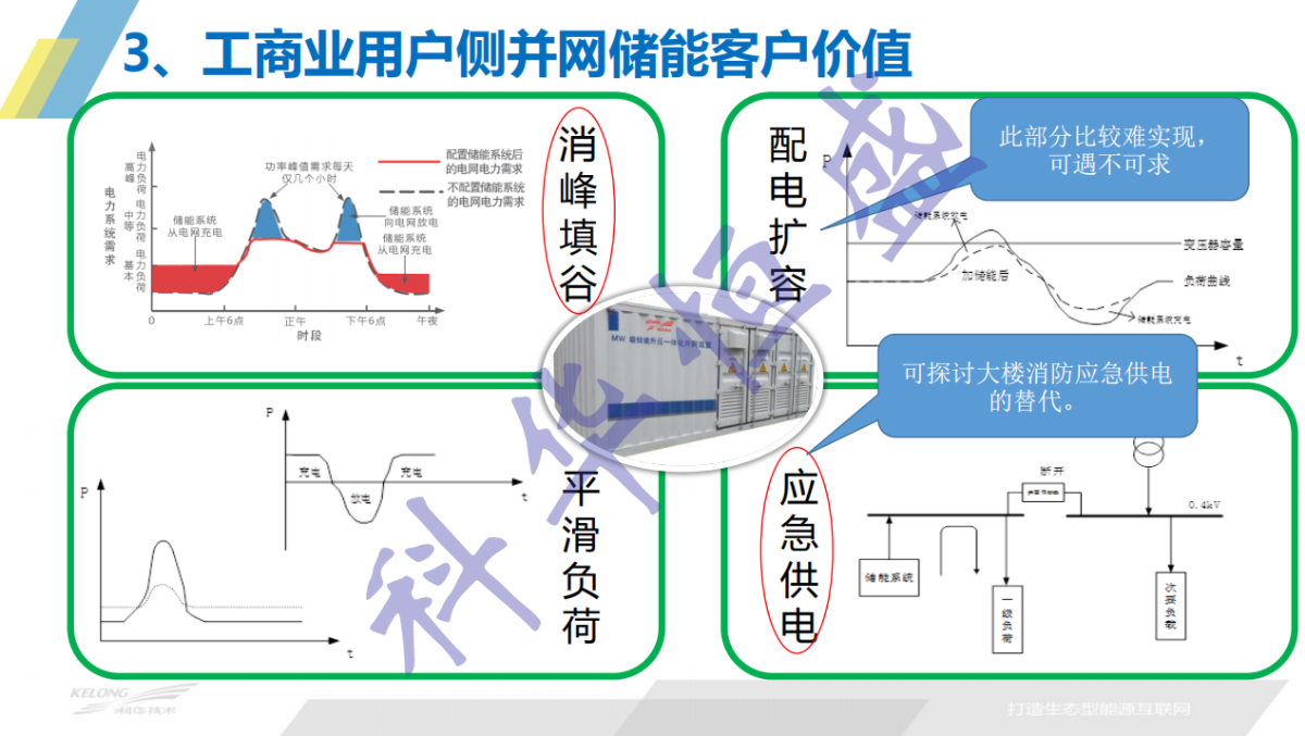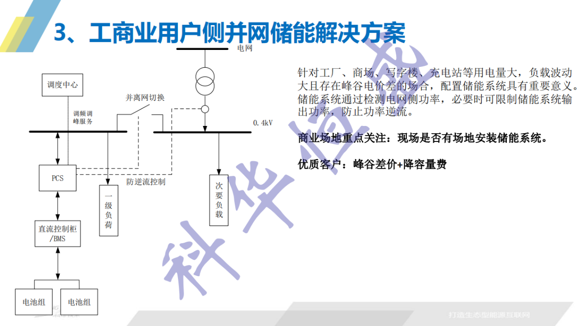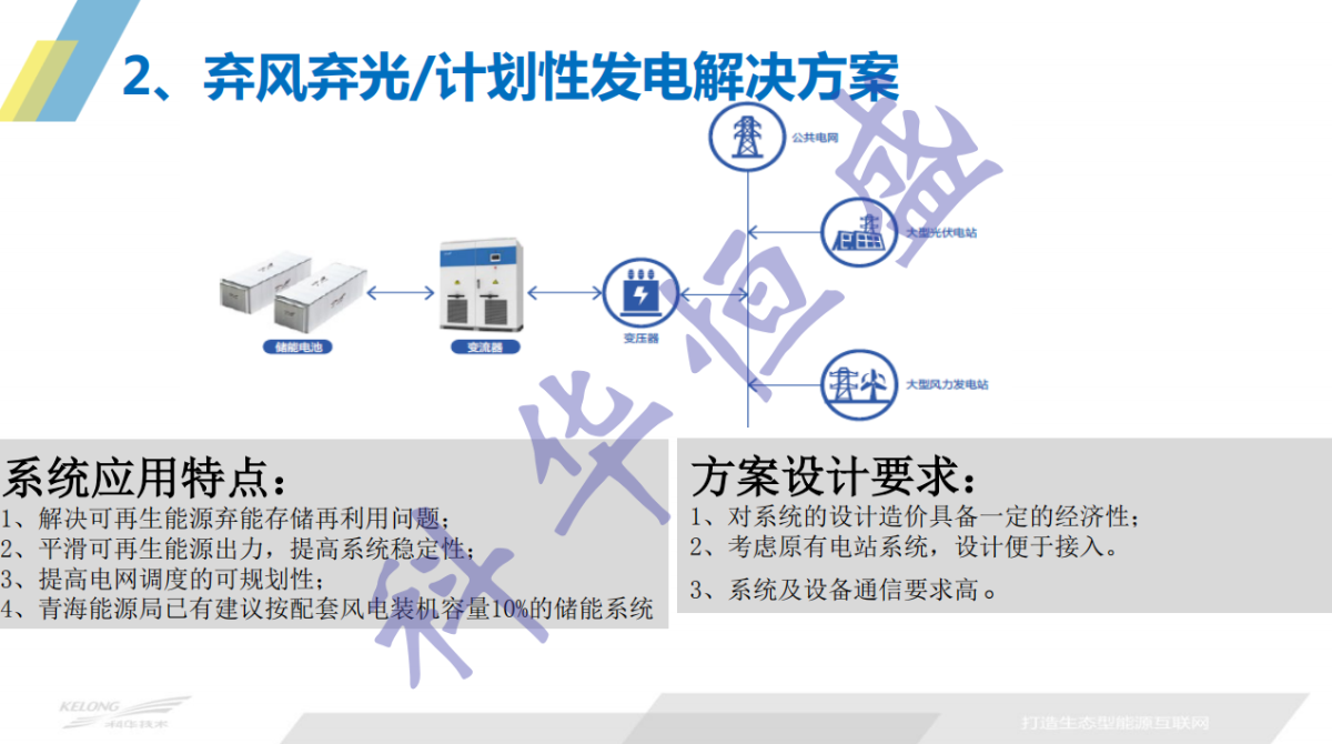 最后介紹一下我們并機的專利技術,并機在我們公司是比較早已經(jīng)具備這個能力,而且是國內(nèi)首家具備這種能力的公司,在2004年的時候,我們創(chuàng)始人就已經(jīng)申請這么一個專利并聯(lián)技術,所以我們在儲能并聯(lián)系統(tǒng)上的一個優(yōu)勢還是比較突出的。接下來簡單介紹一下應用方案和案例,這是調(diào)峰調(diào)頻的解決方案,主要是補償原有的一個發(fā)電機組的控制、相應速度慢的問題,由前面的藍色通過加入儲能后變成后面紅色的這么一個波形。還有計劃性的解決方案也可以儲能系統(tǒng),平滑或者再利用光伏新能源的能量。這是用戶側(cè)的儲能解決方案,這套系統(tǒng)可以實現(xiàn)并網(wǎng),也可以實現(xiàn)離網(wǎng),也可以實現(xiàn)并離網(wǎng)切換。