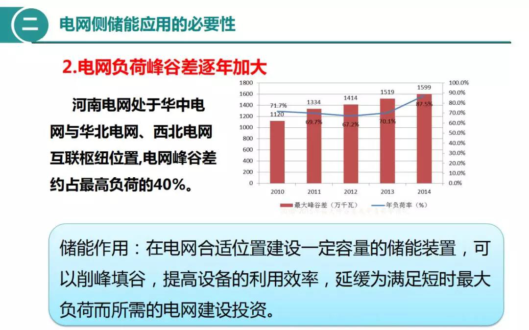 河南電網(wǎng)處于華中電網(wǎng)與華北電網(wǎng)、西北電網(wǎng)互聯(lián)樞紐位置,電網(wǎng)峰谷差約占最高負荷的40%。在電網(wǎng)合適位置建設一定容量的儲能裝置,可以削峰填谷,提高設備的利用效率,延緩為滿足短時最大負荷所需的電網(wǎng)建設投資。我們也做過對比,常規(guī)通過擴建110和220變電站,大概在5800元每千瓦,現(xiàn)在通過儲能成本可以控制在4000元以內(nèi)。
