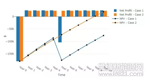 圖4.兩個項(xiàng)目的現(xiàn)金流量。藍(lán)色線條表示采用一種更積極的策略,沒有考慮退化,但獲得更多收入。橙色線條表示采用了更為保守的策略,可以減少退化。