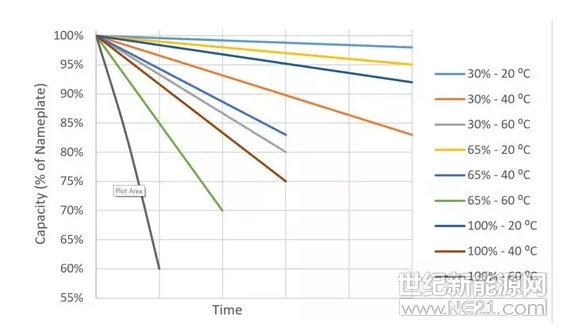 圖2.鋰離子電池在平均充電狀態(tài)和溫度不同組合下的容量降低情況。例如,綠色線段顯示電池工作在65%充電狀態(tài)和60°C時的性能下降情況