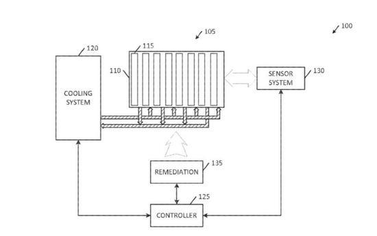 該專利申請(qǐng)表示,一旦過(guò)熱反應(yīng)開(kāi)始,過(guò)熱就會(huì)在整個(gè)電池組內(nèi)或者電池組內(nèi)一部分蔓延,直到過(guò)熱電池充分冷卻,否則整個(gè)電池組或部分電池組會(huì)被耗盡。但是,電池必須加熱到200攝氏度才可釋放能量。雖然高壓電解造成電池過(guò)熱的風(fēng)險(xiǎn)很大,但是另一風(fēng)險(xiǎn),即電解化學(xué)反應(yīng),產(chǎn)生氫氣也會(huì)出現(xiàn)。某些條件下,電解過(guò)程中釋放的氫氣會(huì)積聚在電池組內(nèi)部,會(huì)造成威脅。