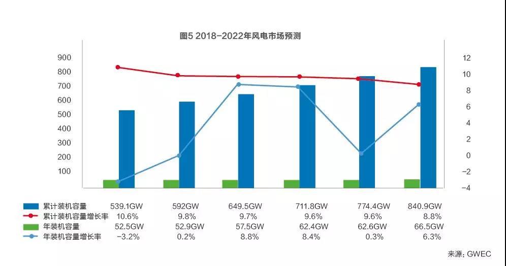 而根據(jù)GWEC《2017年全球風(fēng)電發(fā)展報(bào)告》對(duì)2018-2022年全球風(fēng)電市場(chǎng)的預(yù)測(cè),2018年全球風(fēng)電市場(chǎng)將基本保持在2017年的水平,2019年和2020年全球風(fēng)電市場(chǎng)恢復(fù)增長(zhǎng),21世紀(jì)20年代初將再次突破60吉瓦;到2022年底,累計(jì)風(fēng)電裝機(jī)容量總量將達(dá)到840吉瓦。(見圖5)