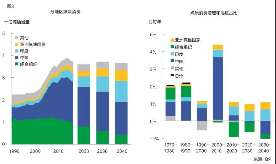 BP認(rèn)為,煤炭消費(fèi)在展望期間大體平緩,2040年煤炭在一次能源中的比例下降至21%,達(dá)到自工業(yè)革命以來的最低值。盡管中國(guó)煤炭消費(fèi)見頂,中國(guó)依然是世界上最大的煤炭市場(chǎng),到2040年占全球煤炭需求的40%。中國(guó)和經(jīng)合組織消費(fèi)量減少的部分,將被印度及其他新興亞洲經(jīng)濟(jì)體的需求增加所抵消。印度是煤炭最大的增長(zhǎng)市場(chǎng),在全球煤炭需求中的占比將從2016年的略高于10%翻倍至2040年的25%左右。(見圖3)