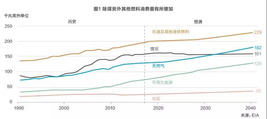 各機(jī)構(gòu)預(yù)測(cè),向更低碳的能源結(jié)構(gòu)轉(zhuǎn)型將會(huì)持續(xù)。EIA認(rèn)為,到2040年,世界范圍內(nèi),除煤炭外其他燃料消費(fèi)量均呈增加態(tài)勢(shì)(見圖1)。
