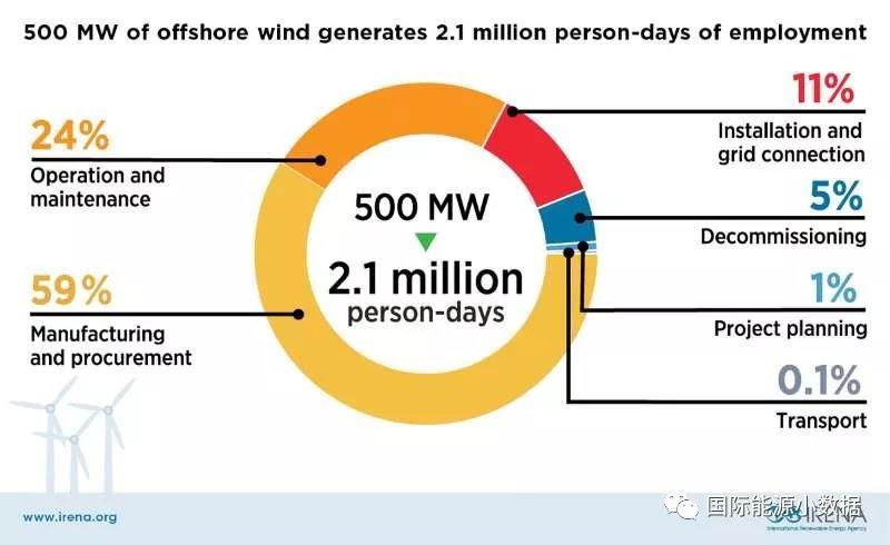 根據(jù)國際可再生能源署(IRENA)的數(shù)據(jù),一座500兆瓦的海上風(fēng)電場可創(chuàng)造210萬人-天的就業(yè)機(jī)會。其中59%的就業(yè)崗位用于制造和采購、24%運(yùn)行和維護(hù)、11%安裝和聯(lián)網(wǎng)、5%風(fēng)場退役、1%項(xiàng)目規(guī)劃、0.1%用于運(yùn)輸。