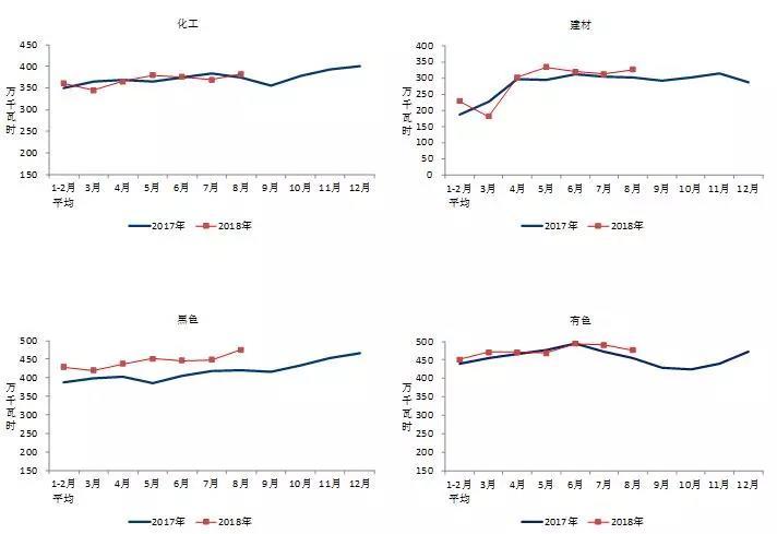 8月份,四大高載能行業(yè)用電量合計1659億千瓦時,同比增長7.4%,占全社會用電量的比重為25.4%。其中,化工行業(yè)用電量382億千瓦時,同比增長3.3%;建材行業(yè)用電量325億千瓦時,同比增長6.1%;黑色金屬行業(yè)用電量475億千瓦時,同比增長14.0%;有色金屬冶煉行業(yè)477億千瓦時,同比增長5.6%。