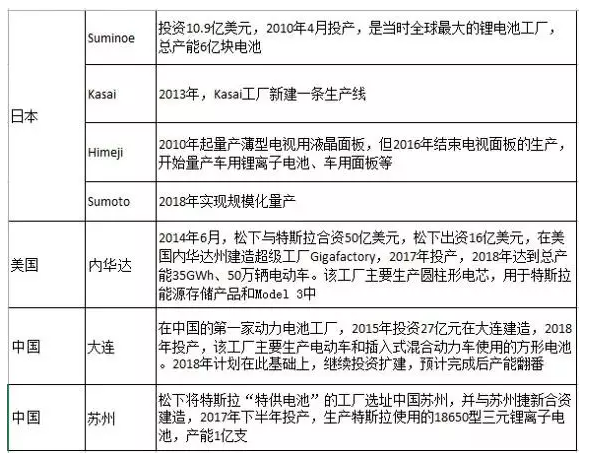 為滿(mǎn)足客戶(hù)需求及穩(wěn)固龍頭位置,松下一直不斷擴(kuò)充動(dòng)力電池產(chǎn)能。公司2015動(dòng)力電池產(chǎn)能達(dá)13GWh,2017年約22.5GWh,預(yù)計(jì)2018年達(dá)到33GWh,2020年達(dá)到52GWh。目前,松下在日本、美國(guó)、中國(guó)分別有4個(gè)、1個(gè)、2個(gè)動(dòng)力電池工廠,具體如下: