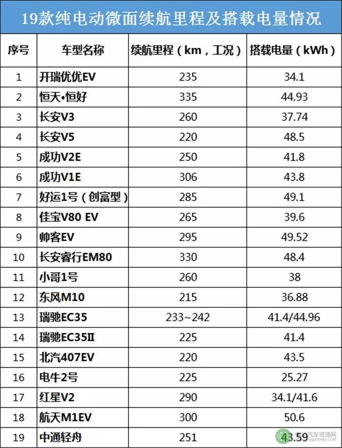 經(jīng)電動汽車資源網(wǎng)統(tǒng)計,19款電動微面續(xù)航里程在215~330km區(qū)間,續(xù)航里程250km以上有12款,續(xù)航能力較好;搭載電量在25.27~50.6kWh區(qū)間,40kWh以上有13款,表明其需要面對充電時間較長的問題。