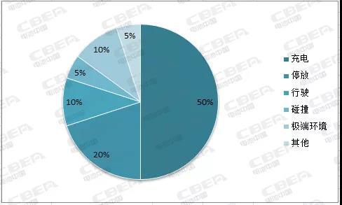 第一場景是充電,充電中和充滿電之后發(fā)生安全問題,大概占50%;第二場景是停放,部分新能源汽車在購置后使用率偏低,或者是即將報廢車輛在沒有拆除電池包的情況下長期擱置停放,約占20%;第三場景是行駛,約占10%;第四場景是碰撞,約占5%;第五場景是極端環(huán)境或者說惡劣天氣,出現(xiàn)動力電池絕緣密封性能下降,泡水后短路等故障問題,約占10%;另外,其他場景,約占5%。