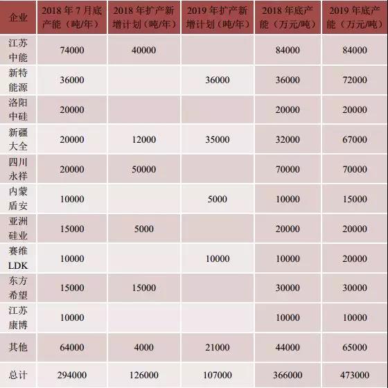 根據(jù)協(xié)會的統(tǒng)計,2018年下半年國內(nèi)多晶硅產(chǎn)能增量在17.5萬噸,到2018年底,國內(nèi)多晶硅產(chǎn)能可達(dá)43.9萬噸??紤]到部分增量將暫緩或者終止,下半年實際新增量大約在12.6萬噸,預(yù)計2018年底國內(nèi)多晶硅總產(chǎn)能在36.6萬噸,同比凈增9萬噸,預(yù)計到2019年底預(yù)計產(chǎn)能將達(dá)到47.3萬噸。