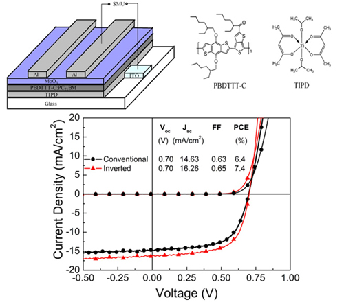 研究人員于2006年首次將TIPD用于傳統(tǒng)結構聚合物太陽能電池的負極修飾層,使基于MEH-PPV/PCBM的聚合物太陽能電池的效率從無此修飾層的1.66%提高到2.52%(ApplPhysLett,2007,91:023509)。這一電極修飾層材料獲授權中國發(fā)明專利1項(“一種聚合物太陽能電池及其制備方法”,專利號:ZL200610089192.3)。近期,他們又將TIPD用于反向結構聚合物太陽能電池,使用TIPD修飾ITO作負極、MoO3/Al作為正極、PBDTTT-C/PC70BM的共混膜為活性層構筑了反向結構器件。同時研究了TIPD修飾層熱處理溫度對器件光伏性能的影響,發(fā)現(xiàn)60oC熱處理后使TIPD表面由親水變?yōu)樵魉?50oC處理10分鐘的修飾層器件性能最佳。這一最佳熱處理溫度與傳統(tǒng)器件PEDOT:PSS修飾層的熱處理溫度相同,保證了TIPD修飾層將來在柔性基底電極上的應用。