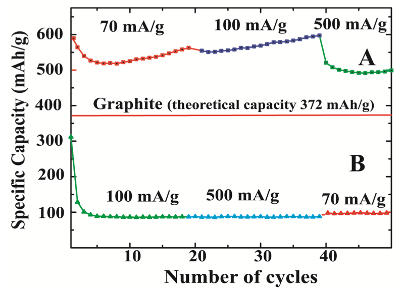 長期穩(wěn)定的放電容量比:(A)銅涂層氫化非晶硅;(B)原始氫化非晶硅;中間紅線表示石墨的理論存儲容量。來源:得克薩斯大學(xué)