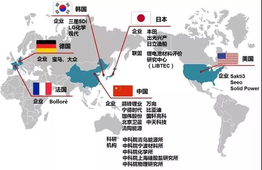 由于當(dāng)前磷酸鐵鋰和三元鋰電池自身的瓶頸,以及固態(tài)電池的潛在優(yōu)勢,歐美、日韓、中國等國家的涉及動(dòng)力電池、汽車及能源方面的產(chǎn)業(yè)鏈上眾多企業(yè)正在積極布局和研發(fā)固態(tài)電池。
