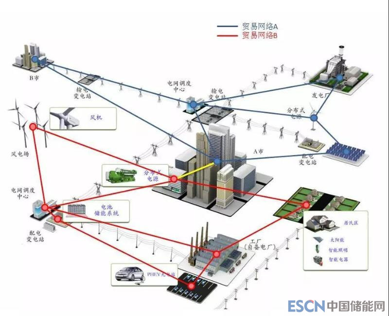 節(jié)點電價所采用的物理潮流模型屬于圖2中第1層(電力系統(tǒng)層)的網絡模型,但電能商品的交易(貿易)關系包括比物理電網更多的社會和經濟屬性,為體現這種復雜的交易(貿易)關系,本文引入“貿易網絡”的概念,一個相關的概念是運營管理(Operations Management)課程中所講的“供應鏈網絡”(Supply chain network,https://en.wikipedia.org/wiki/Supply_chain_network)。供應鏈網絡是基本供應鏈(supply chain)的發(fā)展。由于技術的快速進步,具有基本供應鏈的商業(yè)組織可以將這個鏈發(fā)展成更復雜的結構,涉及更多商業(yè)組織之間的更高層面的相互依賴性和連接性,因而形成供應鏈網絡。在電力市場中,貿易網絡或供應鏈網絡是一種由發(fā)、用電權交易而組成的抽象的網絡,與物理電網是兩回事。電能商品貿易網絡與物理電網的關系可用圖3來表示。圖3中,在同一個物理電網的基礎上,形成了2個貿易網絡,藍色的貿易網絡A由主力化石能源發(fā)電廠、A市的主要商業(yè)負荷、B市負荷和少量可再生能源的電能交易而形成,采用統(tǒng)一電能價格(不含輸配電價)。而紅色的貿易網絡B由工廠及其自備電廠、風電場、居民用戶及屋頂太陽能、A市分布式電源及次要商業(yè)負荷、電池儲能系統(tǒng)及PHEV充電站的電能交易形成,采用統(tǒng)一電能價格(不含輸配電價)。2個貿易網絡在A市相連。顯然2個貿易網絡與物理電網的拓撲結構不同,也不服從物理潮流定律,實際上,貿易網絡屬于圖2中第2層(商品交易層)的網絡模型。