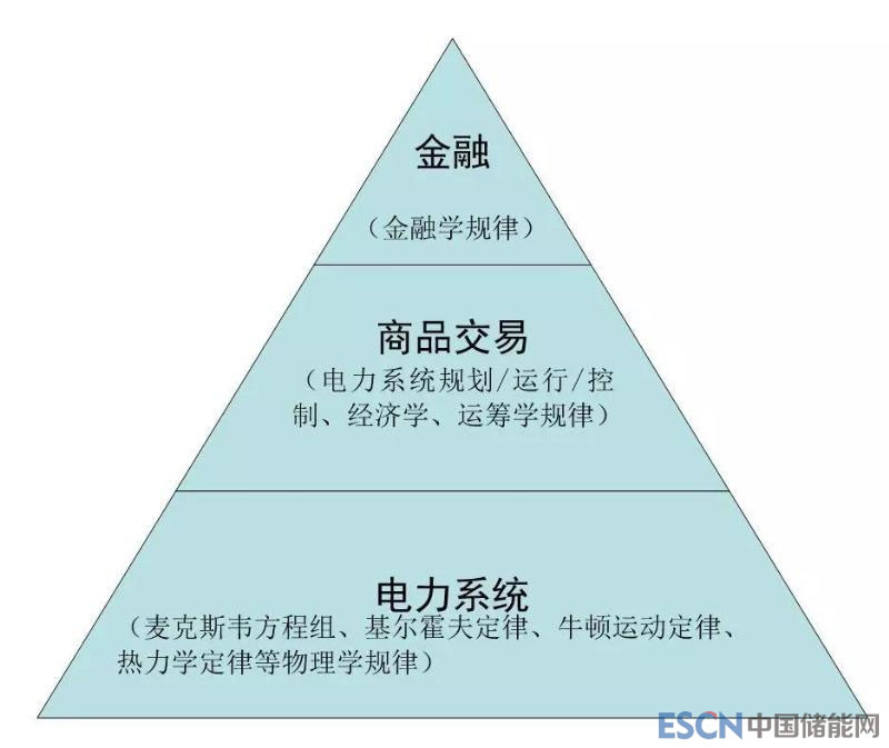 與其他市場顯著不同,電力市場是基于電力系統(tǒng)這個物理網絡而建立的,電力(功率)實時平衡是電力系統(tǒng)穩(wěn)定運行的基本條件,需要比較復雜的調度過程??傮w來說,電力市場/電力系統(tǒng)的問題可分為電力系統(tǒng)物理層、商品交易層和金融交易層3個層次,各自服從不同的規(guī)律,但又互相關聯。在3個不同層次中,“電能”的內涵是完全不同的,如圖2所示。