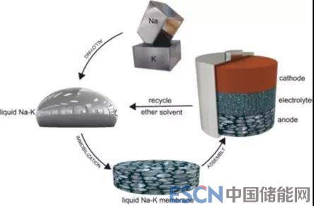 最近,為了更加安全經(jīng)濟(jì)地使用這種活潑液態(tài)金屬負(fù)極,Goodenough 老先生又開發(fā)了一種室溫Na/K合金負(fù)極膜---將合金液體滲透進(jìn)多孔金屬集流體薄膜[9]。這種創(chuàng)造性的設(shè)計(jì)減小了液態(tài)合金負(fù)極表面強(qiáng)勁的表面張力,提高了與液態(tài)電解質(zhì)之間的浸潤(rùn)性,減小了電極/電解質(zhì)界面阻抗。此外,他們還探究了液態(tài)合金與不同電解液的相容性。碳酸酯電解液與合金負(fù)極不互溶,界面穩(wěn)定能夠抑制枝晶生長(zhǎng)又不會(huì)造成電池內(nèi)短路;而醚類電解液會(huì)微量溶解合金負(fù)極,不適合全電池的裝配。