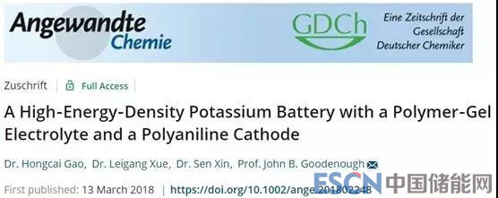 [7] Gao H, Xue L,Xin S, et al. A High-Energy-Density Potassium Battery with a Polymer-GelElectrolyte and a Polyaniline Cathode[J]. Angewandte Chemie InternationalEdition, 2018,57(19):5449-5453.