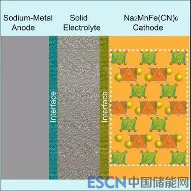 在此基礎(chǔ)上,Goodenough團(tuán)隊(duì)選擇了鈉離子固態(tài)導(dǎo)體NASICON作為固態(tài)電解質(zhì)組裝了高比能全固態(tài)Na/NASICON/Na2MnFe(CN)6鈉電池[6]。固態(tài)電解質(zhì)的應(yīng)用從根本上抑制了晶格水與液態(tài)電解液在高電位下的副反應(yīng),過渡金屬離子也不再與電解液溶劑配位溶解。相比液態(tài)電池體系,固態(tài)電池的鈉負(fù)極界面上由于副反應(yīng)減少而保持著良好的離子傳輸,相應(yīng)的電池庫(kù)倫效率和循環(huán)穩(wěn)定性都有明顯的改善。