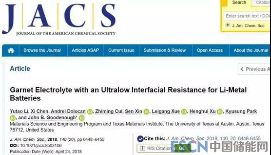 [4] Li Y, Chen X,Dolocan A, et al. Garnet Electrolyte with an Ultralow Interfacial Resistancefor Li-Metal Batteries[J]. Journal of the American Chemical Society,2018,140(20):6448-6455.