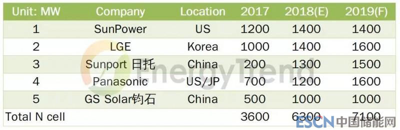 排行首位SunPower的IBC電池一直是業(yè)界的翹楚,雖然2018年初SunPower宣告轉(zhuǎn)投資P型產(chǎn)品線;對于IBC產(chǎn)品仍舊致力于高效率的突破,目前已經(jīng)導(dǎo)入6寸硅晶圓生產(chǎn)作為主力產(chǎn)品,預(yù)期電池轉(zhuǎn)換效率以突破26%為目標(biāo)。排行第二的LGE維持多樣少量產(chǎn)品線的發(fā)展,整體N型產(chǎn)品線除HJT (200MW)之外;也涵蓋N-PERT (600MW)與IBC (600MW)的產(chǎn)能。排行第三的是日托光伏,日托主力發(fā)展 MWT產(chǎn)品,不論應(yīng)用于P型或者N型;日托以此作為技術(shù)選擇的靈活運用,目前市場上所見MWT產(chǎn)品皆為日托所制作;包含蘇美達輝倫也是采用日托代工產(chǎn)品,未來對于2018年第三批領(lǐng)跑者計劃使用的MW產(chǎn)品;確實是一股特異的引領(lǐng)風(fēng)潮。后面排行第四的Panasonic與第五的鈞石(GS Solar)都是HJT 電池廠商,鈞石更計劃生產(chǎn)高效雙面異質(zhì)結(jié)(HDT)組件以提高N型產(chǎn)品的最佳輸出。